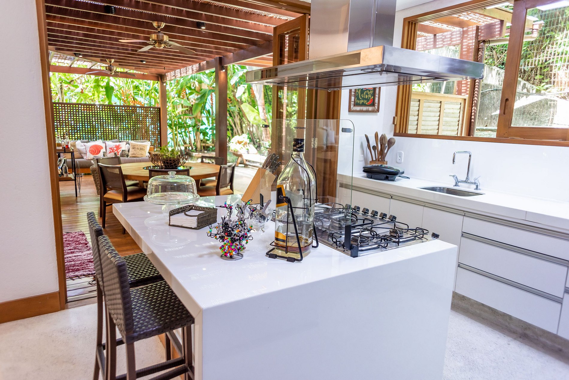 Temos ampla sala de estar com tv, integrada com sala de jantar , cozinha equipada com todos os utensílios e rede wifi que abrange toda a residência. Ampla área privativa, de frente para a mata atlântica com Char-Broil.