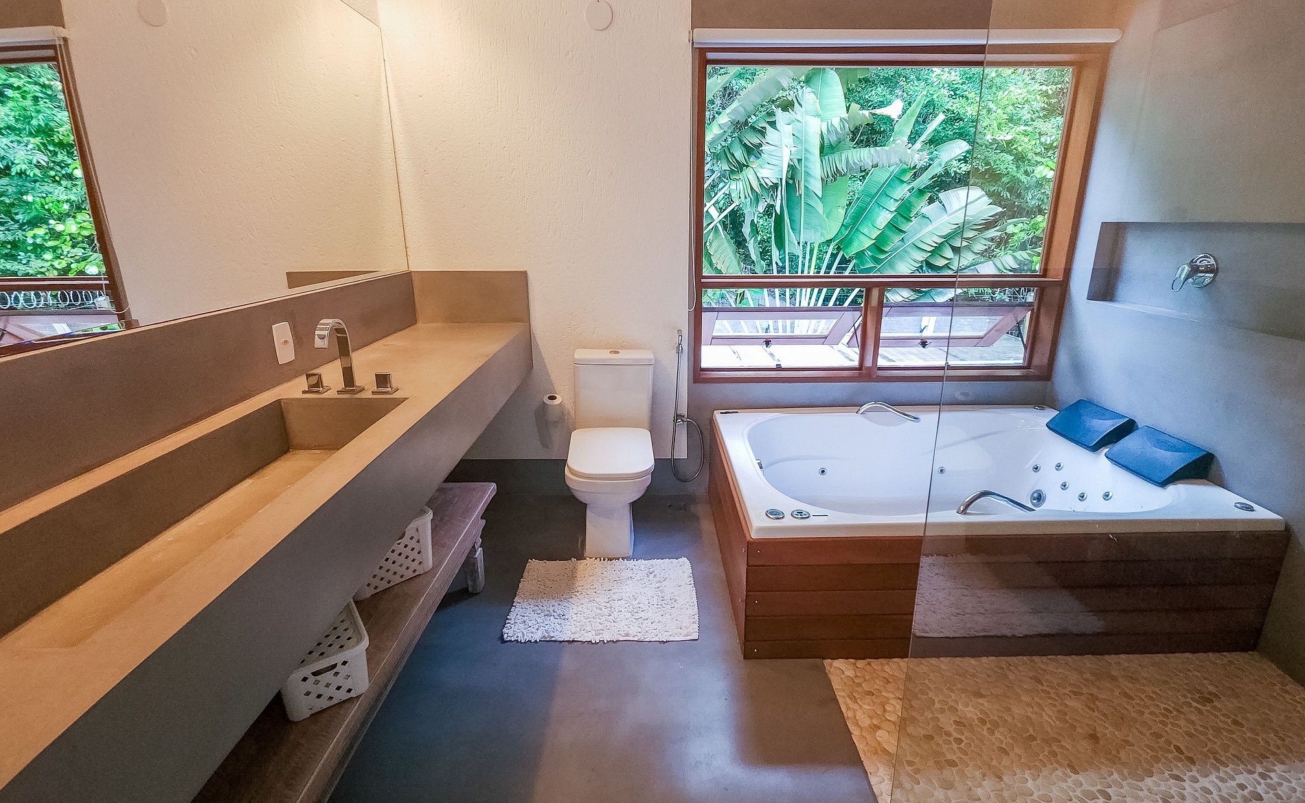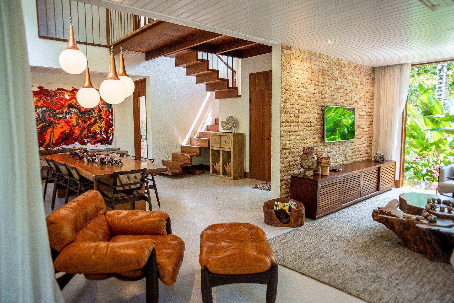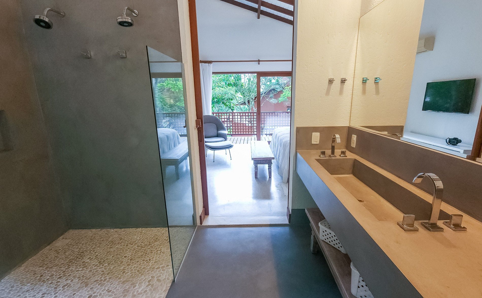 - 3 suítes no andar superior com ar condicionado e varanda privativa, sendo 1 suíte master com TV Smart 4k com Sky e hidromassagem;