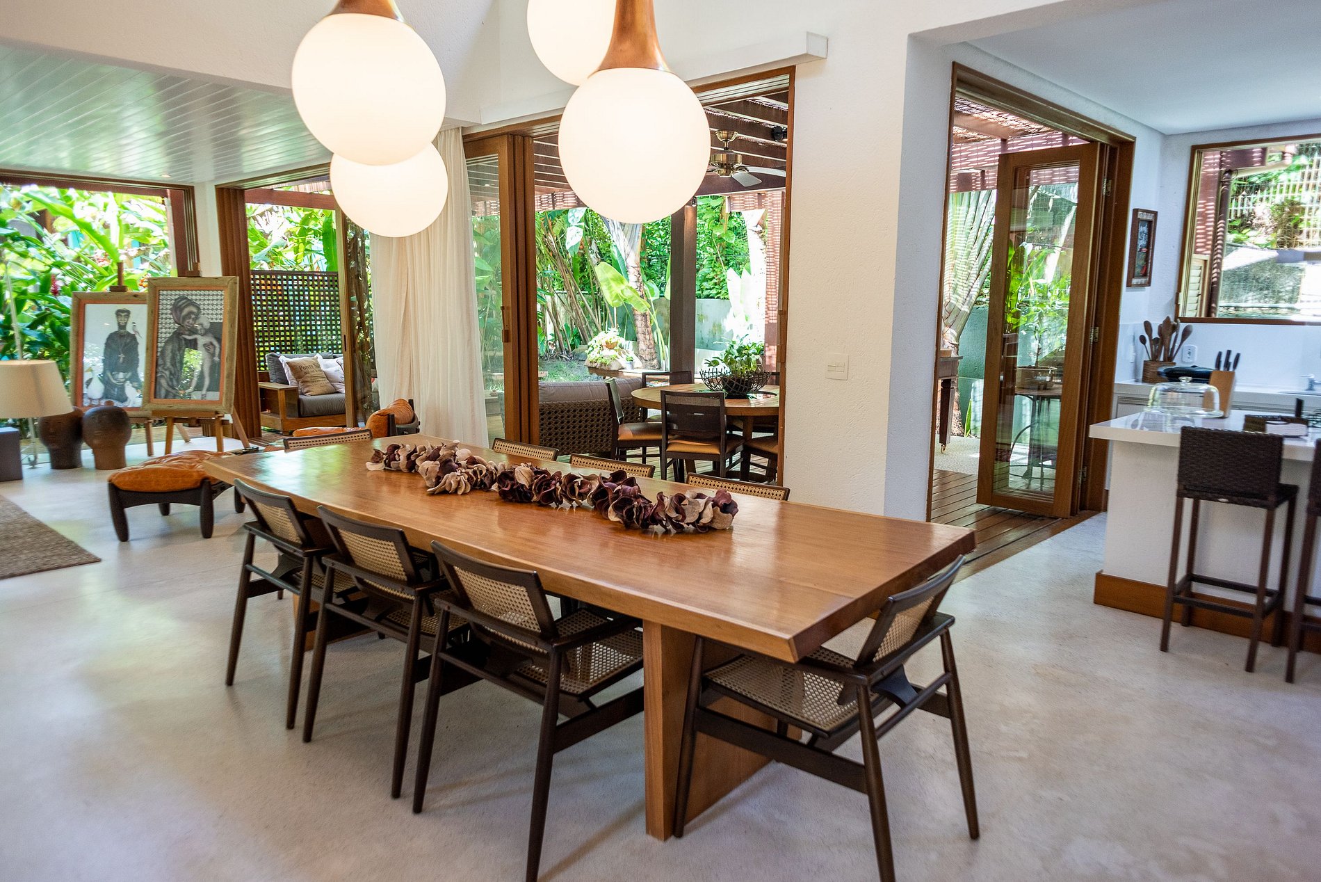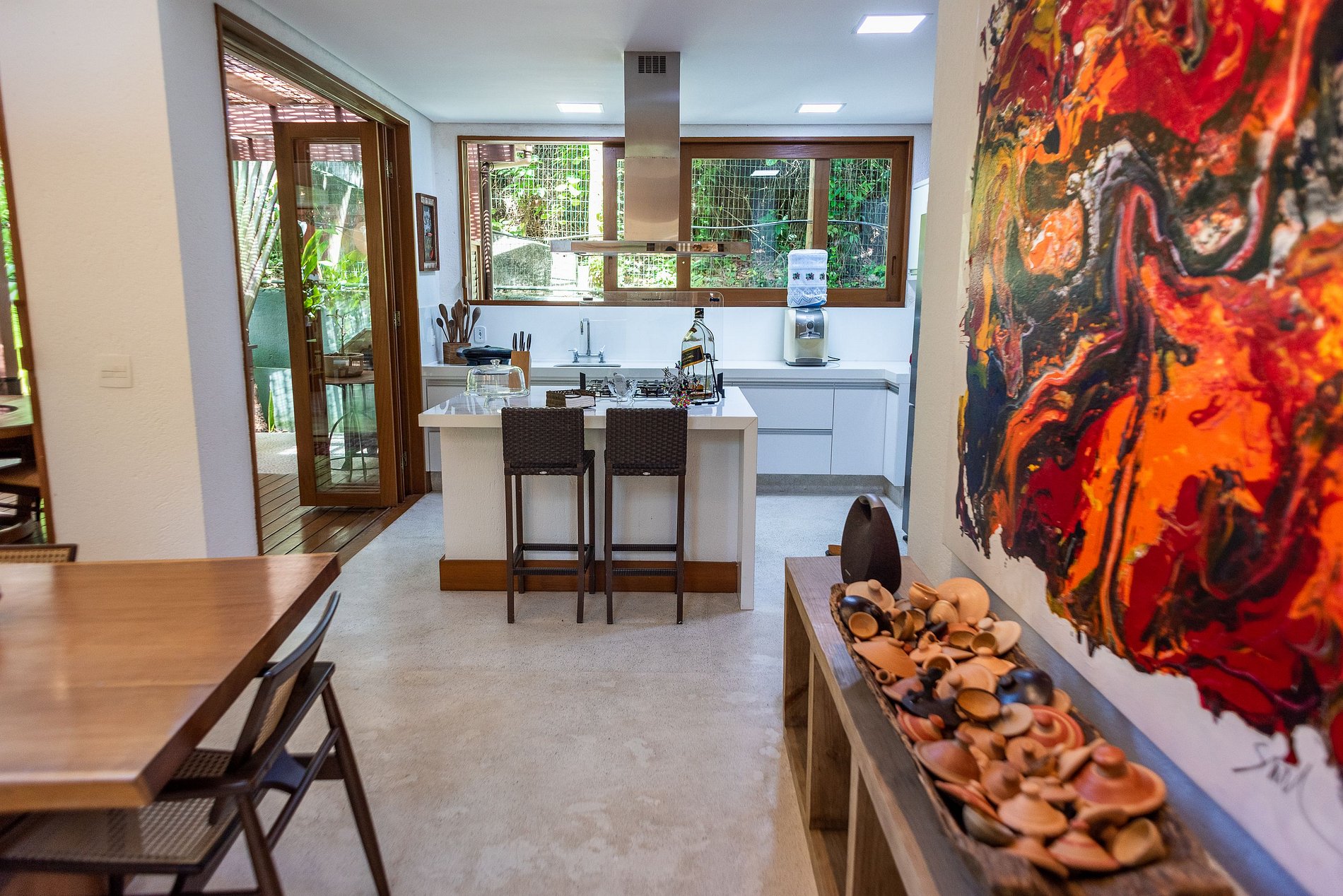 Temos ampla sala de estar com tv, integrada com sala de jantar , cozinha equipada com todos os utensílios e rede wifi que abrange toda a residência. Ampla área privativa, de frente para a mata atlântica com Char-Broil.